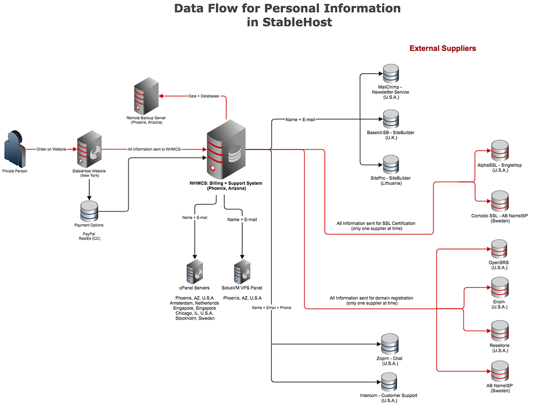The Customer acknowledges that Personal Data provided for registration of domain names will be publicly accessible via the Internet at the appropriate Registration Unit chosen by StableHost. If customer chooses not to use "Whois Privacy", the following information will be accessible: Name, Email Address, and Domain Name. For example: If the customer registers a .com domain, personal data will be present / processed at both StableHost and the registry holder, which in this case is .com. It is the Customer's obligation to inform affected persons in their organization of the above and to hold an authorization to handle Personal Data in the manner specified above.